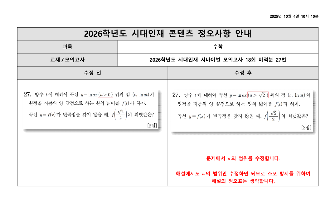 ■ 2026 수학 서바이벌 모의고사 18회 정오사항